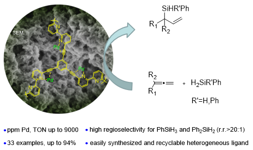 38. A conjugated microporous polymer as a recyclable heterogeneous ligand for highly efficient regioselective hydrosilylation of allenes.